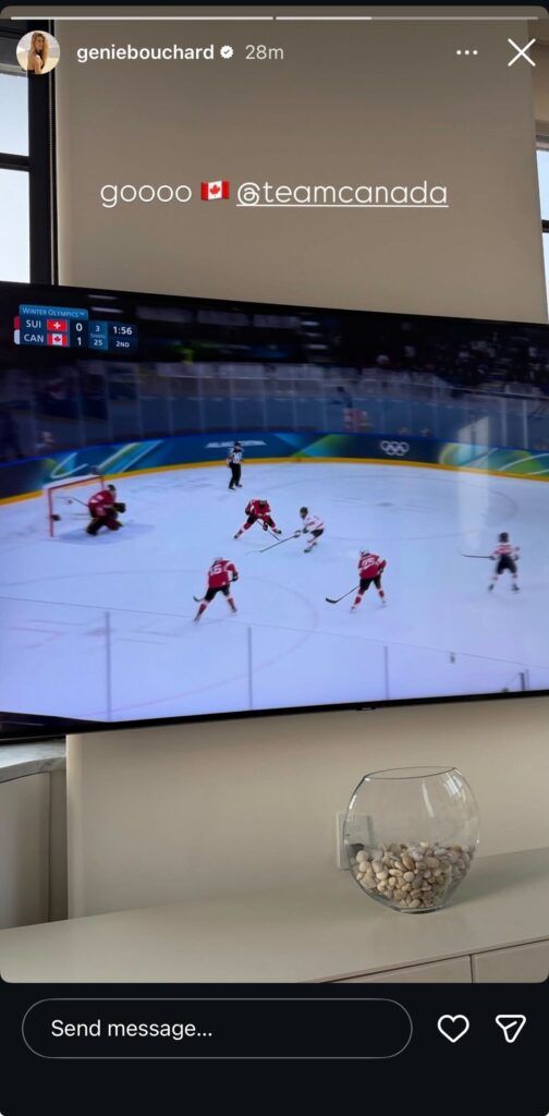 Eugenie Bouchard tuned in for Canada’s women’s ice hockey opener against Switzerland and cheered the team on as they kicked off their campaign for a record sixth gold medal with an emphatic 4-0 victory.