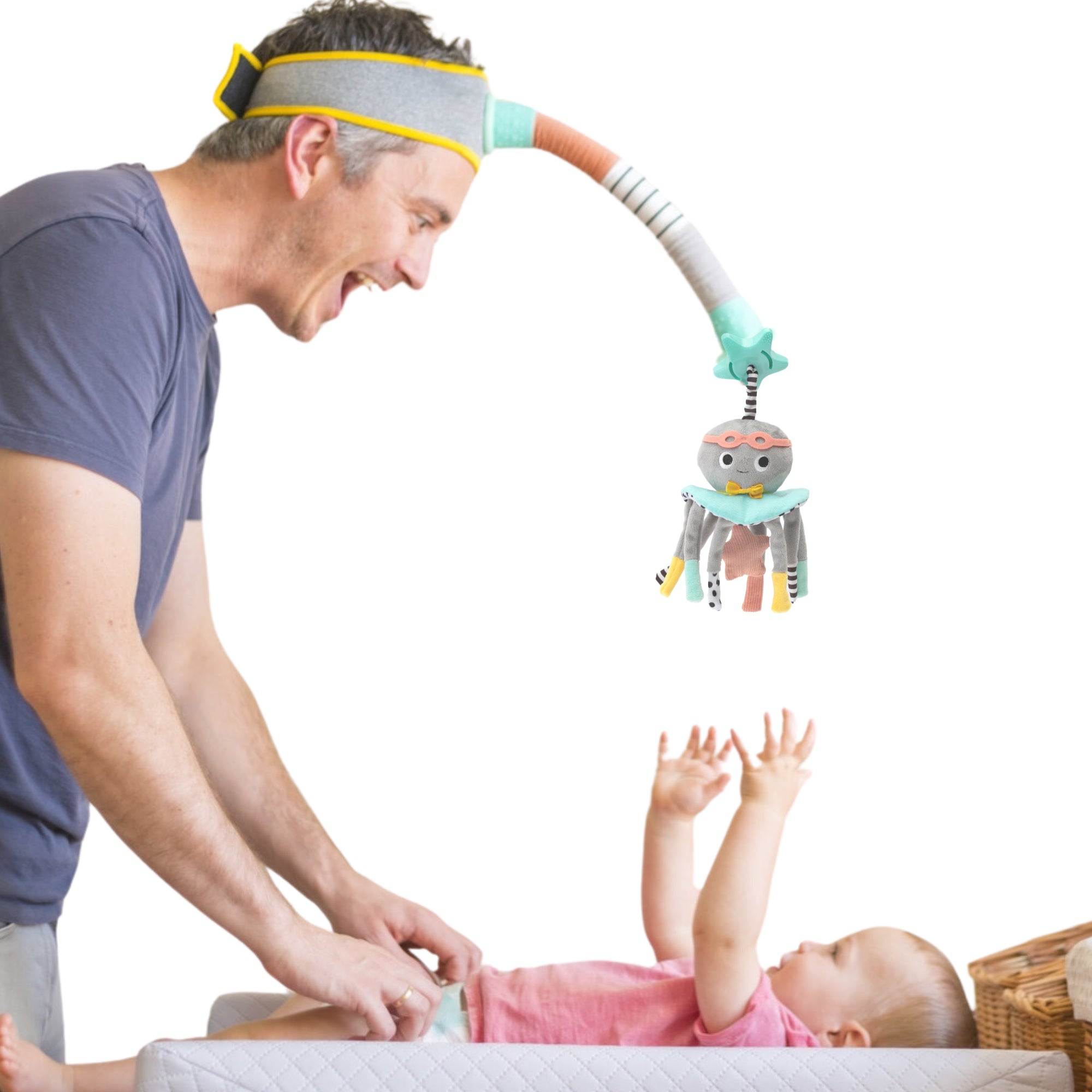 Meet Dingle Dangle. This three-in-one baby portable set is designed to make diaper changes quieter and playtime smarter. Converts to three smart baby products in one easy-to-swap design: an auxiliary changing headband, an easy-to-attach travel mobile, and a sensory rattle. The changing headband fits all head sizes with a child-safe Velcro closure and easy mobile phone clip system.