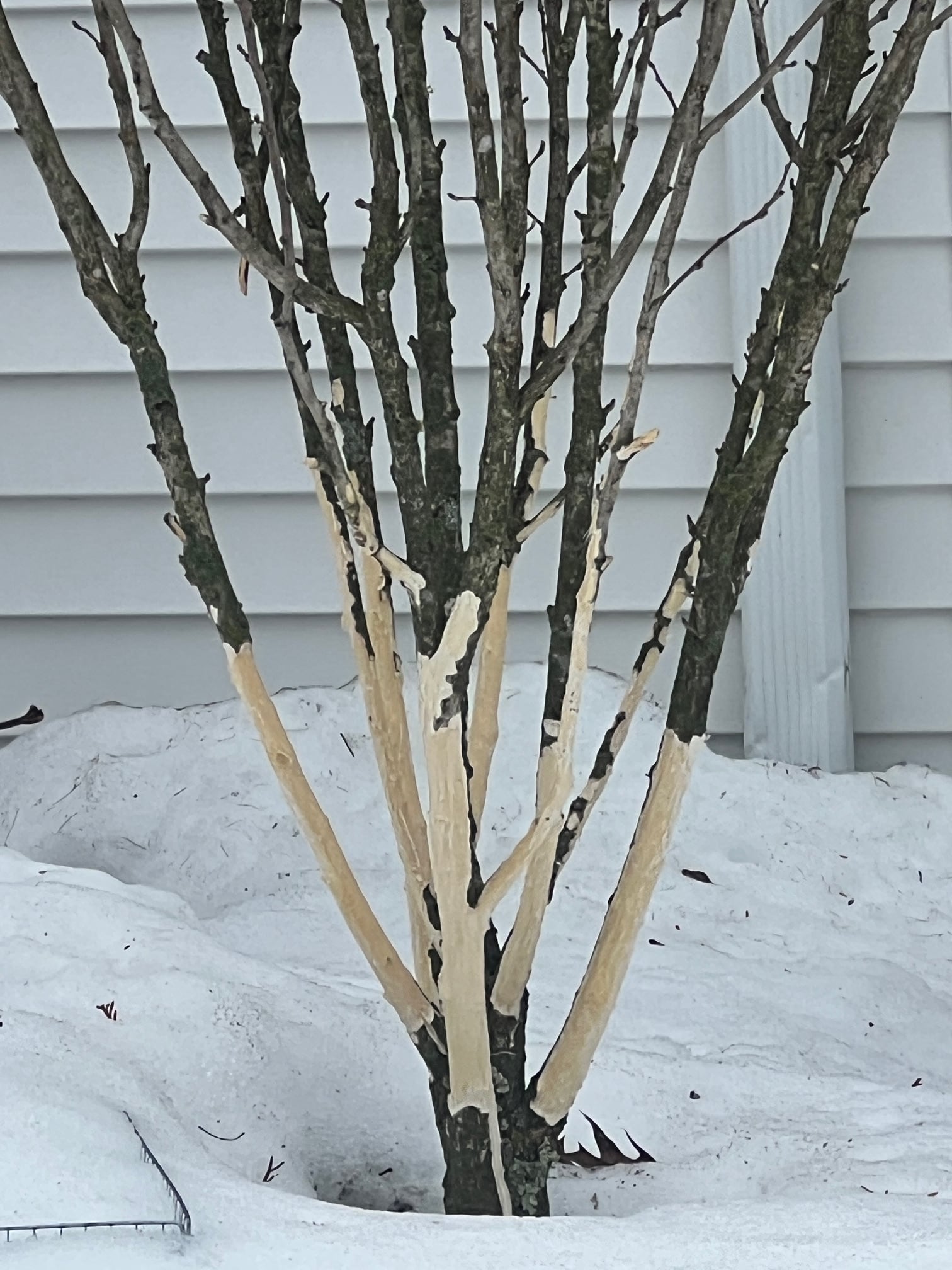 Winter snowstorms have brought a new threat to the shrubs and small trees in our backyard. They appear to have covered the rabbits’ food sources, which then shifted to the thin bark found on the lower parts of shrubs and small trees. Check out the photo I took today of the Pink Rose of Sharon. I’m afraid she won’t survive.